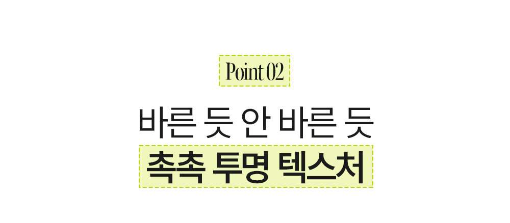 실리카, 정제수, 다이부틸아디페이트, 디에칠아미노하이드록시벤조일헥실벤조에이트, 부틸옥틸살리실레이트, 네오펜틸글라이콜다이헵타노에이트, 합성왁스, 다이카프릴릴에터, 다이프로필렌글라이콜, 에칠헥실트리아존, 비스-에칠헥실옥시페놀메톡시페닐트리아진, 세레신, 오조케라이트, 라우릴폴리글리세릴-3폴리다이메틸실록시에틸다이메티콘, C18-21알케인, 나이아신아마이드, 쌀겨왁스, 스테아릴헵타노에이트, 폴리글리세릴-4다이아이소스테아레이트/폴리하이드록시스테아레이트/세바케이트, 마그네슘설페이트, 코코-카프릴레이트/카프레이트, 프로판다이올, 하이드로제네이티드유채씨오일, 하이드로제네이티드팜오일, 펜타에리스리틸테트라-다이-t-부틸하이드록시하이드로신나메이트, 폴리글리세릴-6폴리하이드록시스테아레이트, 향료, 폴리글리세릴-6폴리리시놀리에이트, 카프릴릭/카프릭트라이글리세라이드, 쇠비름추출물, 판테놀, 부틸렌글라이콜, 글리세릴카프릴레이트, 아크릴레이트코폴리머, 에틸헥실글리세린, 폴리글리세린-6, 트라이소듐에틸렌다이아민다이석시네이트, 스테아랄코늄헥토라이트, 하이드로제네이티드올리브오일불검화물, 아데노신, 프로필렌카보네이트, 빙하수, 토코페롤, 1,2-헥산다이올, 아스코빌팔미테이트, 커피콩추출물, 유칼립투스잎추출물, 월계수잎추출물, 카카오씨추출물, 소듐하이알루로네이트, 하이알루로닉애씨드, 아스코빅애씨드