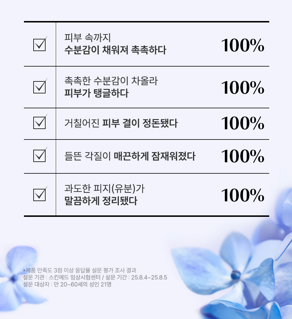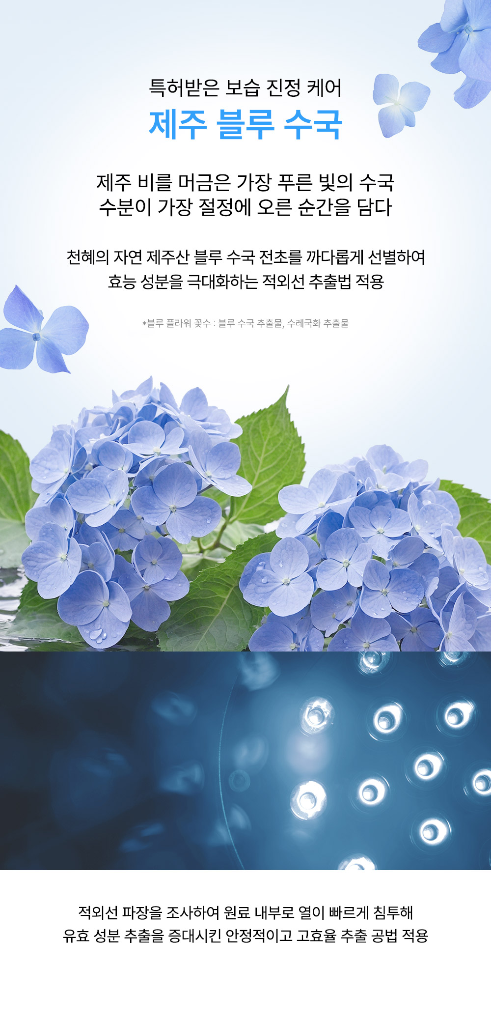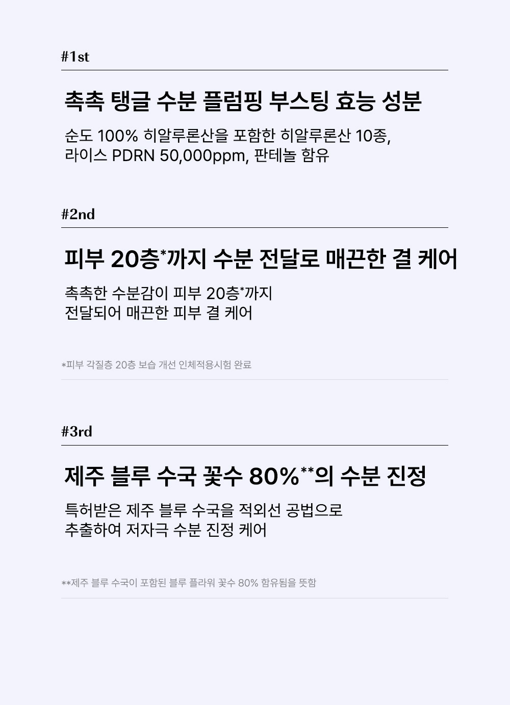 - 정제수, 수레국화꽃수, 글리세린, 메틸프로판다이올, 프로판다이올, 1,2-헥산다이올, 하이드록시아세토페논, 부틸렌글라이콜, 옥틸도데세스-16, 알지닌, 카보머, 아데노신, 향료, 판테놀, 수국잎추출물(40ppm), 판토락톤, 소듐하이알루로네이트(0.1101ppm), 소듐파이테이트, 락토바실러스발효물, 소듐디엔에이, 하이드롤라이즈드소듐하이알루로네이트(0.0151ppm), 다이메틸실란올하이알루로네이트(0.015ppm), 하이드롤라이즈드하이알루로닉애씨드(0.015ppm), 하이알루로닉애씨드(0.01ppm), 포타슘하이알루로네이트(0.01ppm), 소듐하이알루로네이트크로스폴리머(0.008ppm), 하이드록시프로필트라이모늄하이알루로네이트(0.008ppm), 소듐하이알루로네이트다이메틸실란올(0.005ppm), 소듐아세틸레이티드하이알루로네이트(0.004ppm), 하이드로제네이티드레시틴, 병풀추출물, 무화과추출물, 세라마이드엔피, 글라이신, 글루타믹애씨드