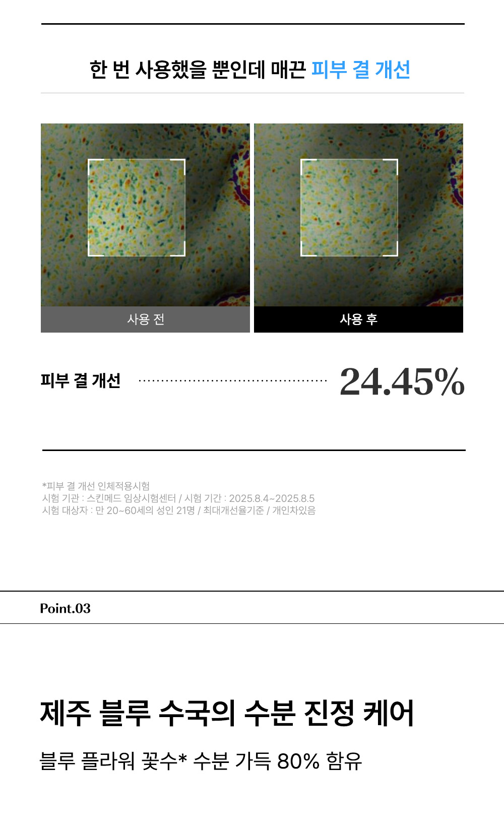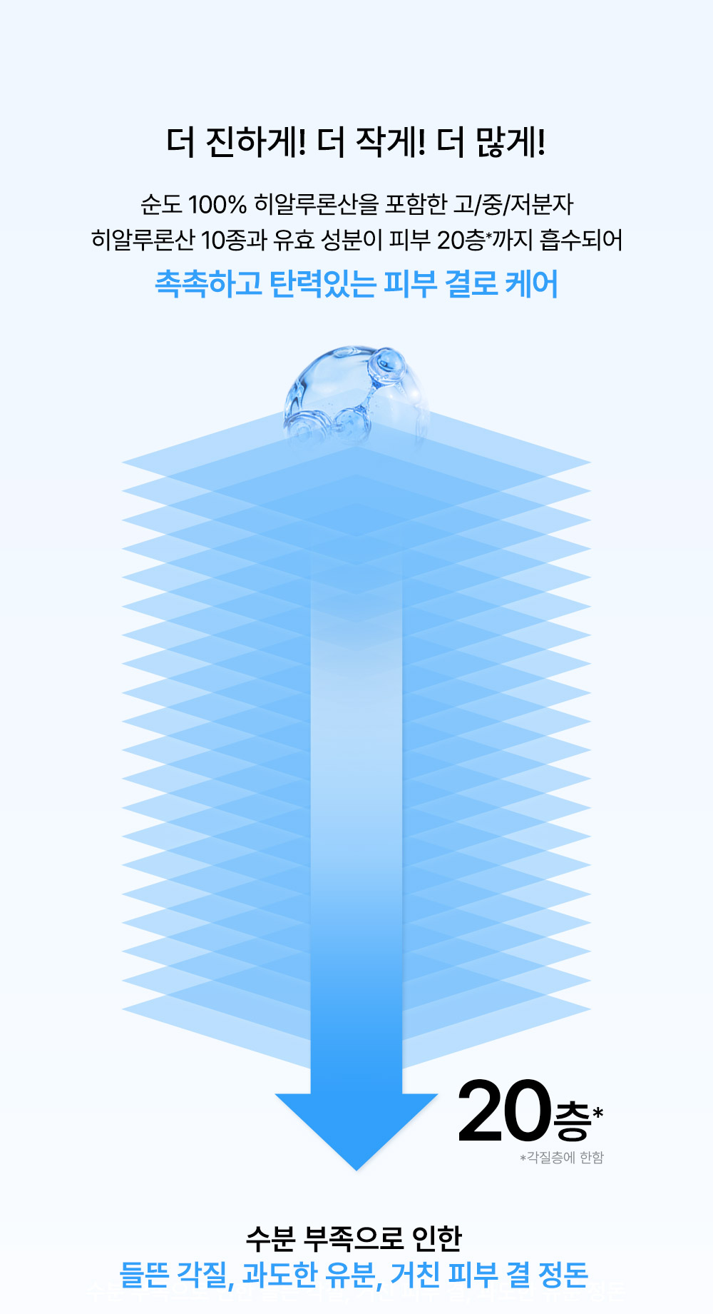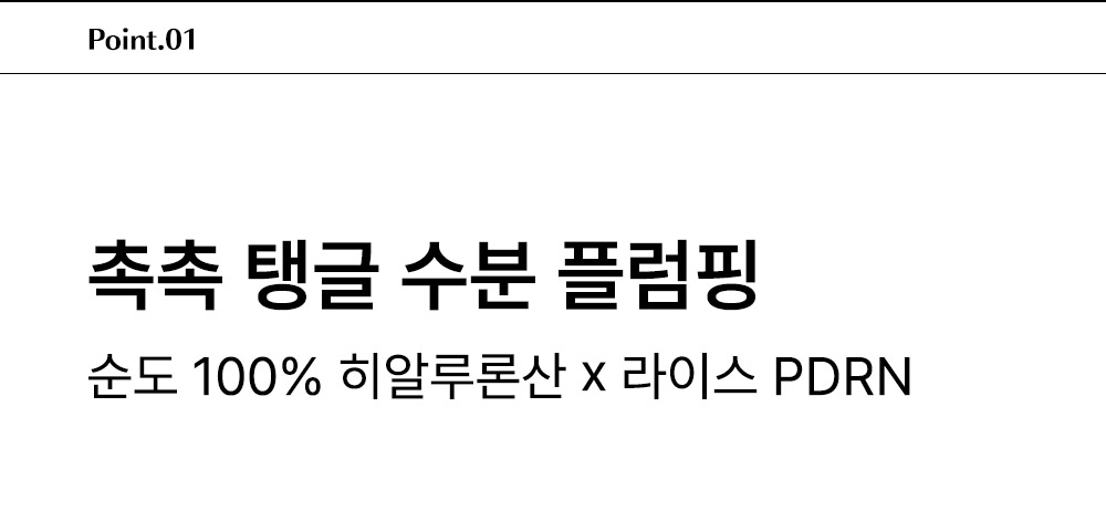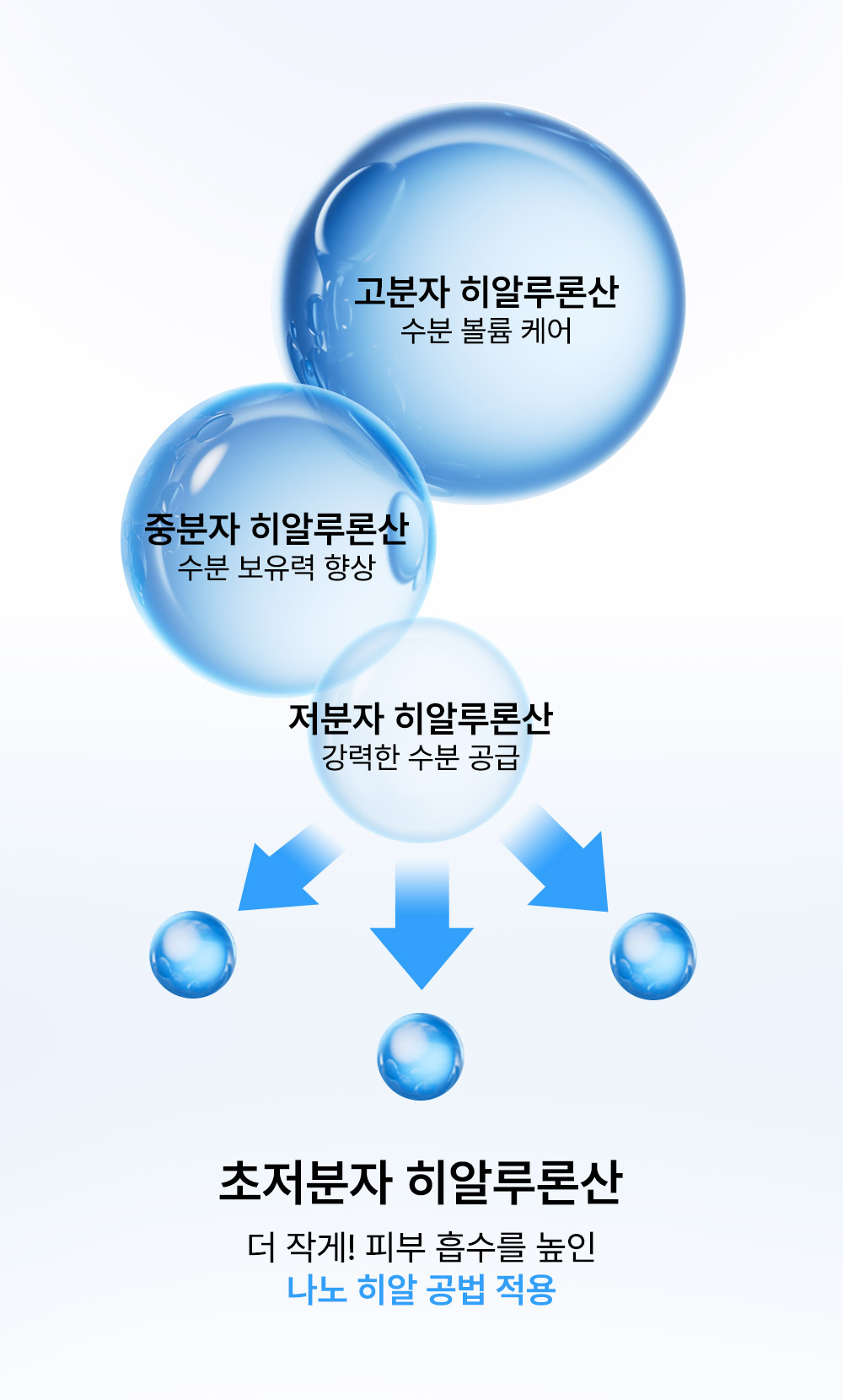 - 정제수, 수레국화꽃수, 글리세린, 메틸프로판다이올, 프로판다이올, 1,2-헥산다이올, 하이드록시아세토페논, 부틸렌글라이콜, 옥틸도데세스-16, 알지닌, 카보머, 아데노신, 향료, 판테놀, 수국잎추출물(40ppm), 판토락톤, 소듐하이알루로네이트(0.1101ppm), 소듐파이테이트, 락토바실러스발효물, 소듐디엔에이, 하이드롤라이즈드소듐하이알루로네이트(0.0151ppm), 다이메틸실란올하이알루로네이트(0.015ppm), 하이드롤라이즈드하이알루로닉애씨드(0.015ppm), 하이알루로닉애씨드(0.01ppm), 포타슘하이알루로네이트(0.01ppm), 소듐하이알루로네이트크로스폴리머(0.008ppm), 하이드록시프로필트라이모늄하이알루로네이트(0.008ppm), 소듐하이알루로네이트다이메틸실란올(0.005ppm), 소듐아세틸레이티드하이알루로네이트(0.004ppm), 하이드로제네이티드레시틴, 병풀추출물, 무화과추출물, 세라마이드엔피, 글라이신, 글루타믹애씨드