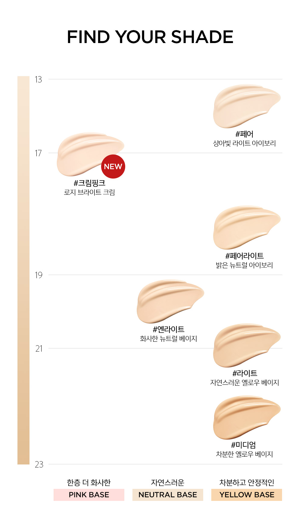 ★ 페어 : 정제수, 사이클로펜타실록산, 티타늄디옥사이드 (CI 77891), 에칠헥실메톡시신나메이트, 트리메칠실록시실리케이트, 에칠헥실살리실레이트, 글리세린, 피이지-10디메치콘, 부틸렌글라이콜, 세틸에칠헥사노에이트, 나이아신아마이드, 펜틸렌글라이콜, 합성플루오르플로고파이트, 카프릴릴메치콘, 폴리프로필실세스퀴옥산, 브이피/헥사데센코폴리머, 마그네슘설페이트, 세틸피이지/피피지-10/1디메치콘, 디스테아디모늄헥토라이트, 스테아릭애씨드, 알루미나, 아크릴레이트/디메치콘코폴리머, 알루미늄하이드록사이드, 트리에톡시카프릴릴실란, 디메치콘, 에칠헥실글리세린, 디메치콘크로스폴리머, 아데노신, 디메치콘/비닐디메치콘크로스폴리머, 폴리글루타믹애씨드, 디소듐이디티에이, 틴옥사이드 (CI 77861), 페녹시에탄올, 향료, 황색산화철 (CI 77492), 적색산화철 (CI 77491), 흑색산화철 (CI 77499), 마이카 (CI 77019)★ 크림핑크 : 정제수, 사이클로펜타실록세인, 티타늄디옥사이드 (CI 77891), 에칠헥실메톡시신나메이트, 트라이메틸실록시실리케이트, 에칠헥실살리실레이트, 글리세린, 피이지-10다이메티콘, 부틸렌글라이콜, 세틸에틸헥사노에이트, 나이아신아마이드, 펜틸렌글라이콜, 합성플루오르플로고파이트, 세틸피이지/피피지-10/1다이메티콘, 카프릴릴메티콘, 폴리프로필실세스퀴옥세인, 브이피/헥사데센코폴리머, 다이스테아다이모늄헥토라이트, 마그네슘설페이트, 아크릴레이트/다이메티콘코폴리머, 스테아릭애씨드, 알루미나, 알루미늄하이드록사이드, 트라이에톡시카프릴릴실레인, 에틸헥실글리세린, 다이메티콘, 아데노신, 트라이소듐에틸렌다이아민다이석시네이트, 다이메티콘/비닐다이메티콘크로스폴리머, 펜타에리스리틸테트라-다이-t-부틸하이드록시하이드로신나메이트, 폴리글루타믹애씨드, 틴옥사이드, 페녹시에탄올, 향료, 황색산화철 (CI 77492), 적색산화철 (CI 77491), 흑색산화철 (CI 77499), 마이카 (CI 77019) ★ 페어라이트 : 정제수,사이클로펜타실록산,티타늄디옥사이드 (CI 77891),에칠헥실메톡시신나메이트,트리메칠실록시실리케이트,에칠헥실살리실레이트,글리세린,피이지-10디메치콘,부틸렌글라이콜,세틸에칠헥사노에이트,나이아신아마이드,펜틸렌글라이콜,합성플루오르플로고파이트,카프릴릴메치콘,폴리프로필실세스퀴옥산,브이피/헥사데센코폴리머,마그네슘설페이트,세틸피이지/피피지-10/1디메치콘,스테아릭애씨드,디스테아디모늄헥토라이트,알루미나,아크릴레이트/디메치콘코폴리머,알루미늄하이드록사이드,트리에톡시카프릴릴실란,디메치콘,에칠헥실글리세린,디메치콘크로스폴리머,아데노신,디메치콘/비닐디메치콘크로스폴리머,폴리글루타믹애씨드,디소듐이디티에이,틴옥사이드 (CI 77861),페녹시에탄올,향료,황색산화철 (CI 77492),적색산화철 (CI 77491),흑색산화철 (CI 77499),마이카 (CI 77019) ★ 엔라이트 : 정제수, 사이클로펜타실록세인, 티타늄디옥사이드 (CI 77891), 에칠헥실메톡시신나메이트, 트라이메틸실록시실리케이트,에칠헥실살리실레이트, 글리세린, 피이지-10다이메티콘, 부틸렌글라이콜, 세틸에틸헥사노에이트, 나이아신아마이드, 펜틸렌글라이콜, 합성플루오르플로고파이트, 황색산화철 (CI 77492), 카프릴릴메티콘, 폴리프로필실세스퀴옥세인, 브이피/헥사데센코폴리머, 마그네슘설페이트, 세틸피이지/피피지-10/1다이메티콘, 다이스테아다이모늄헥토라이트, 스테아릭애씨드, 알루미나, 알루미늄하이드록사이드, 아크릴레이트/다이메티콘코폴리머, 트라이에톡시카프릴릴실레인, 다이메티콘, 에틸헥실글리세린, 다이메티콘크로스폴리머, 아데노신, 다이메티콘/비닐다이메티콘크로스폴리머, 폴리글루타믹애씨드, 다이소듐이디티에이, 틴옥사이드 (CI 77861), 페녹시에탄올, 향료, 적색산화철 (CI 77491), 흑색산화철 (CI 77499), 마이카 (CI 77019) ★라이트 : 정제수,사이클로펜타실록산,티타늄디옥사이드 (CI 77891),에칠헥실메톡시신나메이트,트리메칠실록시실리케이트,글리세린,에칠헥실살리실레이트,피이지-10디메치콘,부틸렌글라이콜,나이아신아마이드,세틸에칠헥사노에이트,펜틸렌글라이콜,황색산화철 (CI 77492),브이피/헥사데센코폴리머,카프릴릴메치콘,폴리프로필실세스퀴옥산,마그네슘설페이트,세틸피이지/피피지-10/1디메치콘,합성플루오르플로고파이트,스테아릭애씨드,디스테아디모늄헥토라이트,알루미나,아크릴레이트/디메치콘코폴리머,알루미늄하이드록사이드,트리에톡시카프릴릴실란,디메치콘,에칠헥실글리세린,디메치콘크로스폴리머,아데노신,디메치콘/비닐디메치콘크로스폴리머,폴리글루타믹애씨드,디소듐이디티에이,틴옥사이드(CI 77861),페녹시에탄올,향료,적색산화철 (CI 77491),흑색산화철 (CI 77499),마이카 (CI 77019) ★미디엄 : 정제수,사이클로펜타실록산,티타늄디옥사이드 (CI 77891),에칠헥실메톡시신나메이트,트리메칠실록시실리케이트,글리세린,에칠헥실살리실레이트,피이지-10디메치콘,부틸렌글라이콜,나이아신아마이드,세틸에칠헥사노에이트,펜틸렌글라이콜,황색산화철 (CI 77492),브이피/헥사데센코폴리머,카프릴릴메치콘,폴리프로필실세스퀴옥산,마