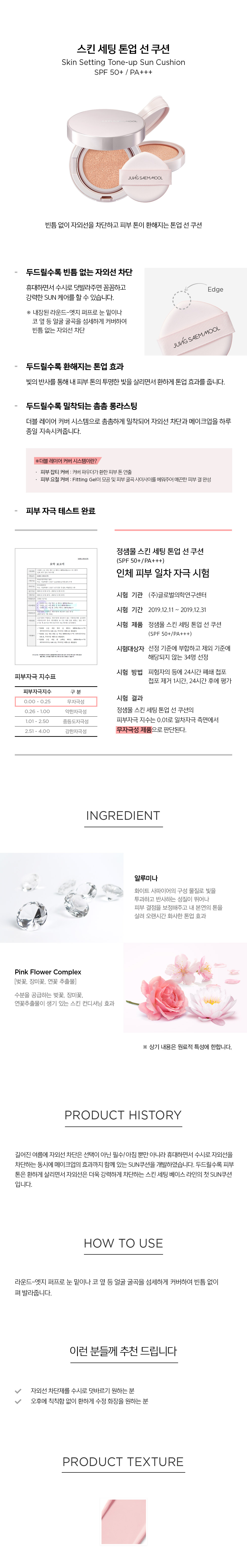 | 모든 원료성분 | 정제수, 티타늄디옥사이드, 사이클로펜타실록세인, 에칠헥실메톡시신나메이트, 부틸렌글라이콜, 하이드로제네이티드폴리데센, 징크옥사이드, 다이페닐실록시페닐트라이메티콘, 세틸에틸헥사노에이트, 세틸피이지/피피지-10/1다이메티콘, 페닐벤즈이미다졸설포닉애씨드, 사이클로헥사실록세인, 변성알코올, 나이아신아마이드, 트라이데실트라이멜리테이트, 소듐클로라이드, 트로메타민, 글리세릴폴리메타크릴레이트, 다이스테아다이모늄헥토라이트, 라우릴피이지-8다이메티콘, 폴리프로필실세스퀴옥세인, 다이메티콘, 실리카, 프로필렌글라이콜, 솔비탄세스퀴올리에이트, 비스-다이글리세릴폴리아실아디페이트-2, 프로판다이올, 트라이메틸실록시실리케이트, 쇠비름추출물, 비즈왁스, 판테놀, 알루미늄하이드록사이드, 에틸렌/프로필렌코폴리머, 글리세릴글루코사이드, 아크릴레이트/에틸헥실아크릴레이트/다이메티콘메타크릴레이트코폴리머, 황색산화철, 소듐벤조에이트, 스테아릭애씨드, 다이메티콘/비닐다이메티콘크로스폴리머, 하이드로젠다이메티콘, 적색산화철, 트라이에톡시카프릴릴실레인, 포타슘솔베이트, 트라이에틸시트레이트, 라우로일라이신, 다마스크장미꽃수, 향료, 프로필렌카보네이트, 폴리하이드록시스테아릭애씨드,세룰라타벚나무꽃추출물,잔탄검,연꽃추출물,다이소듐이디티에이,아데노신,레시틴,아이소프로필미리스테이트,아이소스테아릭애씨드,에틸헥실팔미테이트,글리세린,폴리글리세릴-3폴리리시놀리에이트,소듐하이알루로네이트,하이알루로닉애씨드,하이드롤라이즈드하이알루로닉애씨드,알루미나,소듐폴리아크릴레이트,카프릴릴글라이콜 |