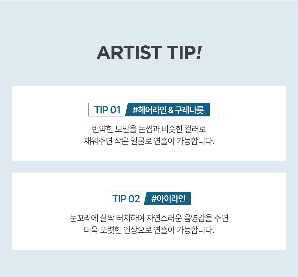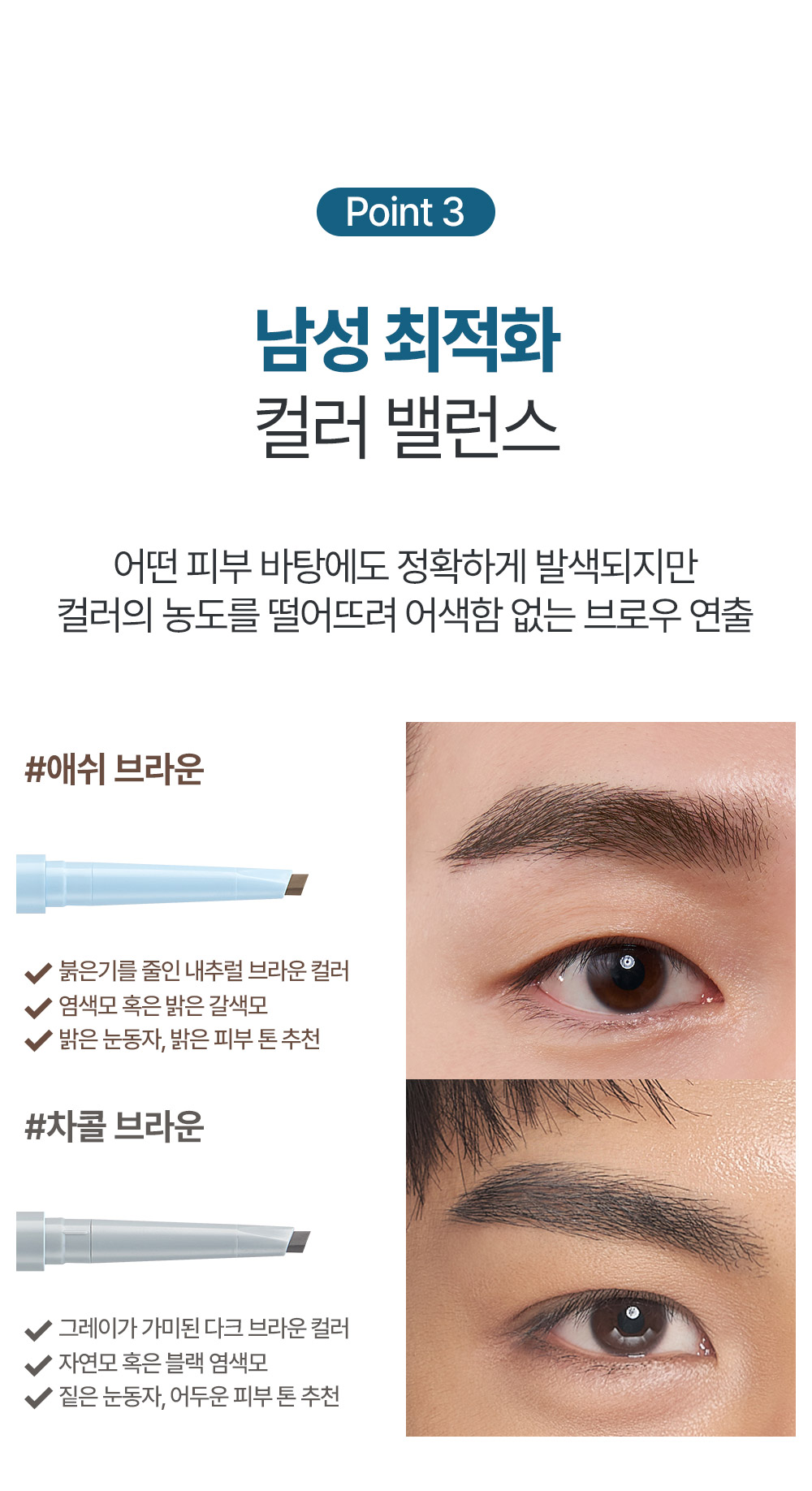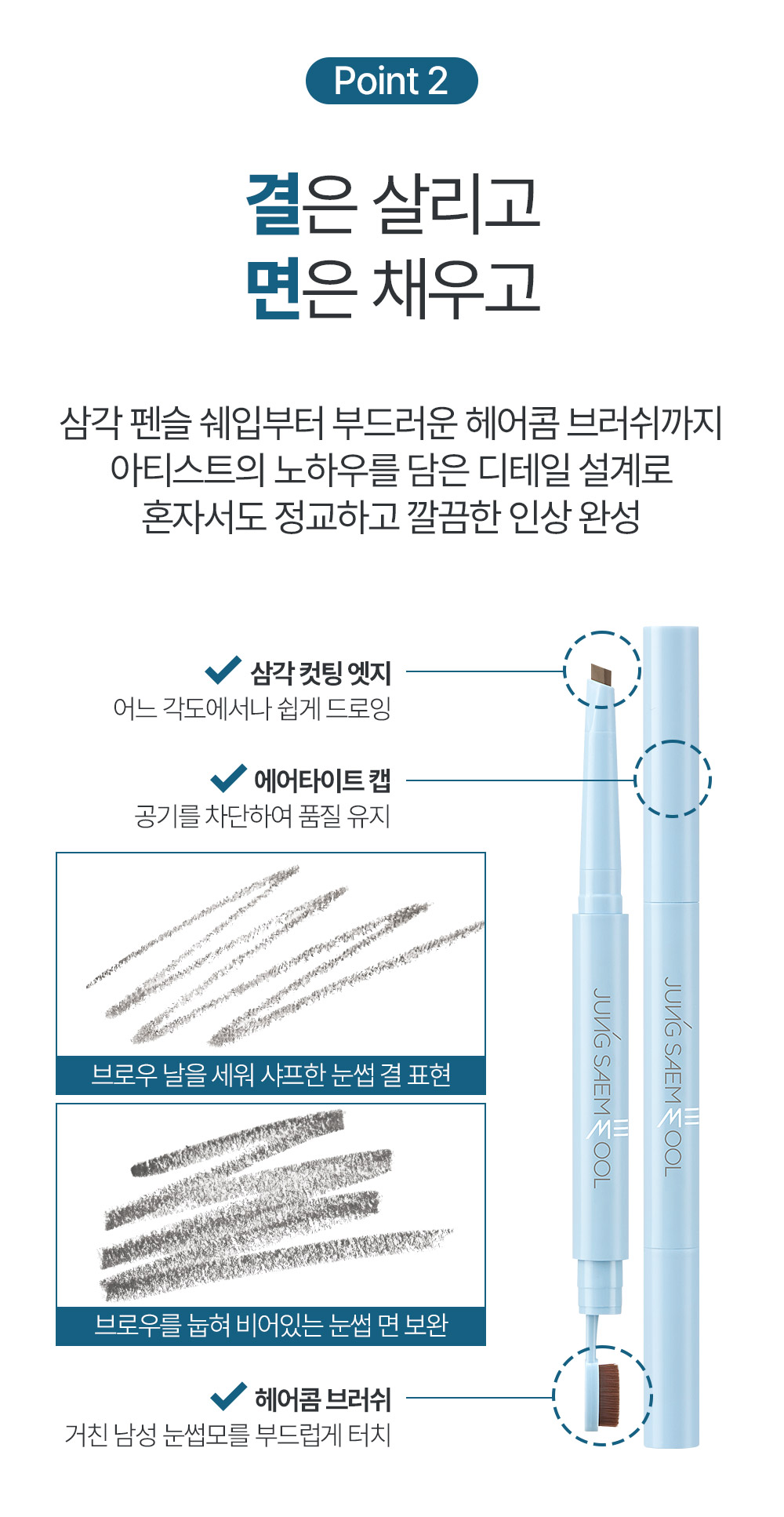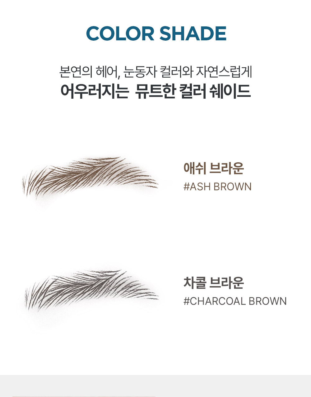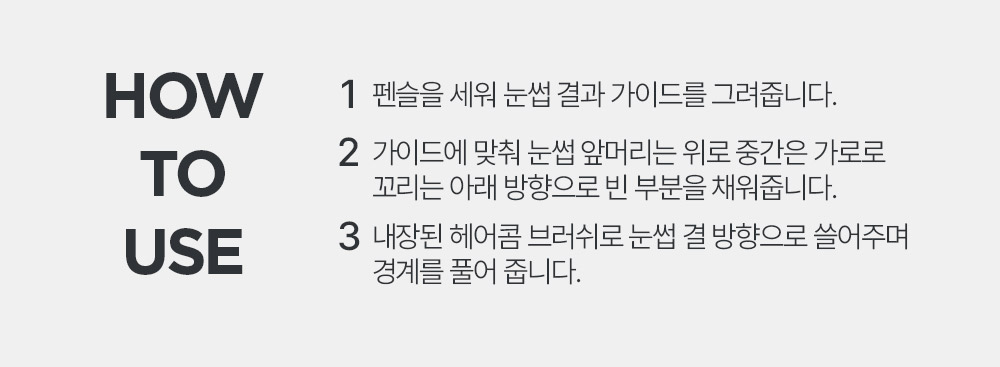 | 사용방법 | 펜슬의 각을 활용하여 원하는 모양으로 눈썹을 그려주고 브러쉬로 자연스럽게 블렌딩 해줍니다. *사용 후 반드시 캡을 닫아 보관해주세요. |