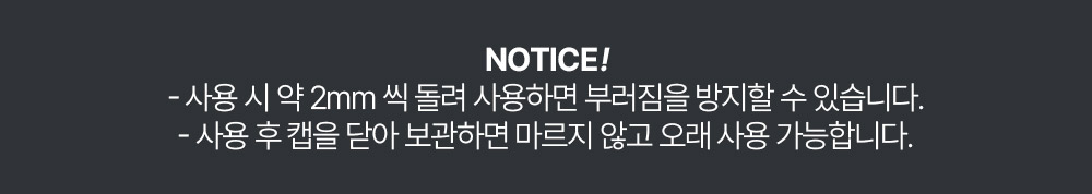 | 사용할 때의 주의사항 | 가. 화장품 사용 시 또는 사용 후 직사광선에 의하여 사용부위가 붉은 반점, 부어오름 또는 가려움증 등의 이상 증상이나 부작용이 있는 경우에는 전문의 등과 상담할 것 나. 상처가 있는 부위 등에는 사용을 자제할 것 다. 보관 및 취급 시 주의사항 1) 어린이의 손이 닿지 않는 곳에 보관할 것 2) 직사광선을 피해서 보관할 것 |