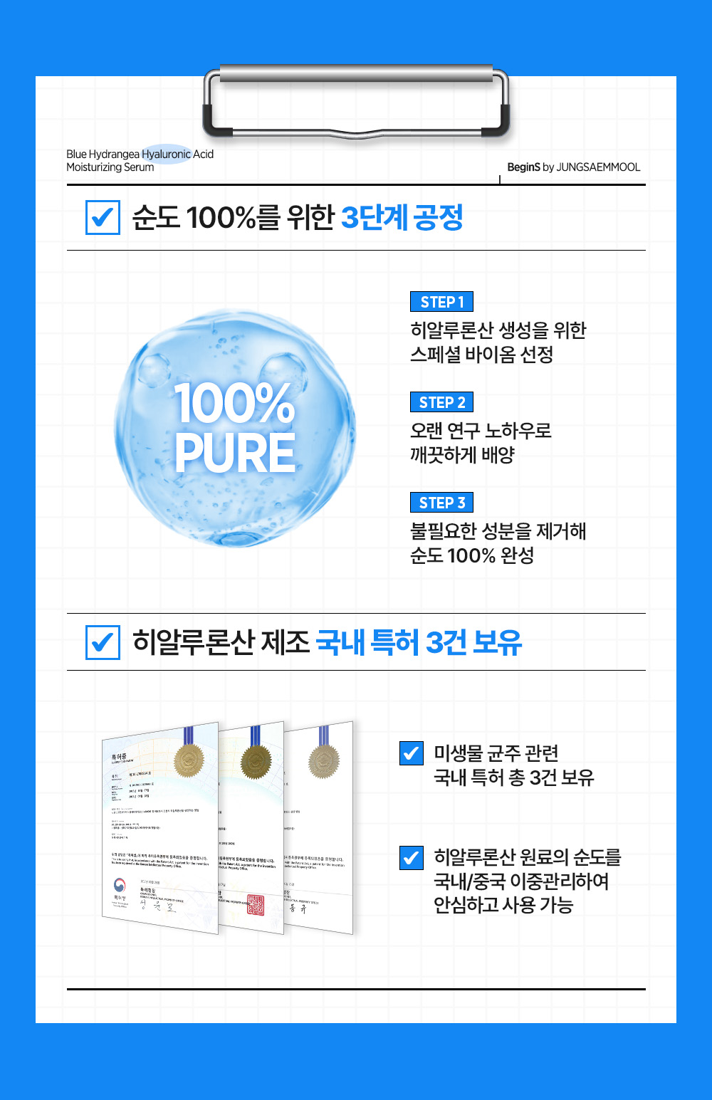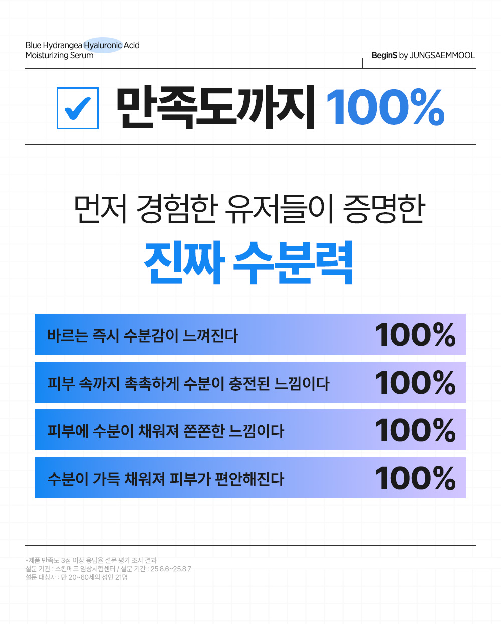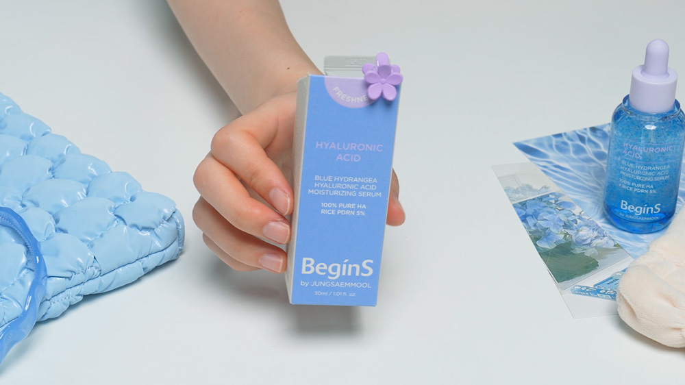 BeginS by JUNGSAEMMOOL Blue Hydrangea Hyaluronic Acid Moisturizing Serum10만개의 나노 히알 볼의 수분 레이어링으로 3초 만에 피부 속까지 촉촉하게 차오르는 수분 플럼핑 세럼 |