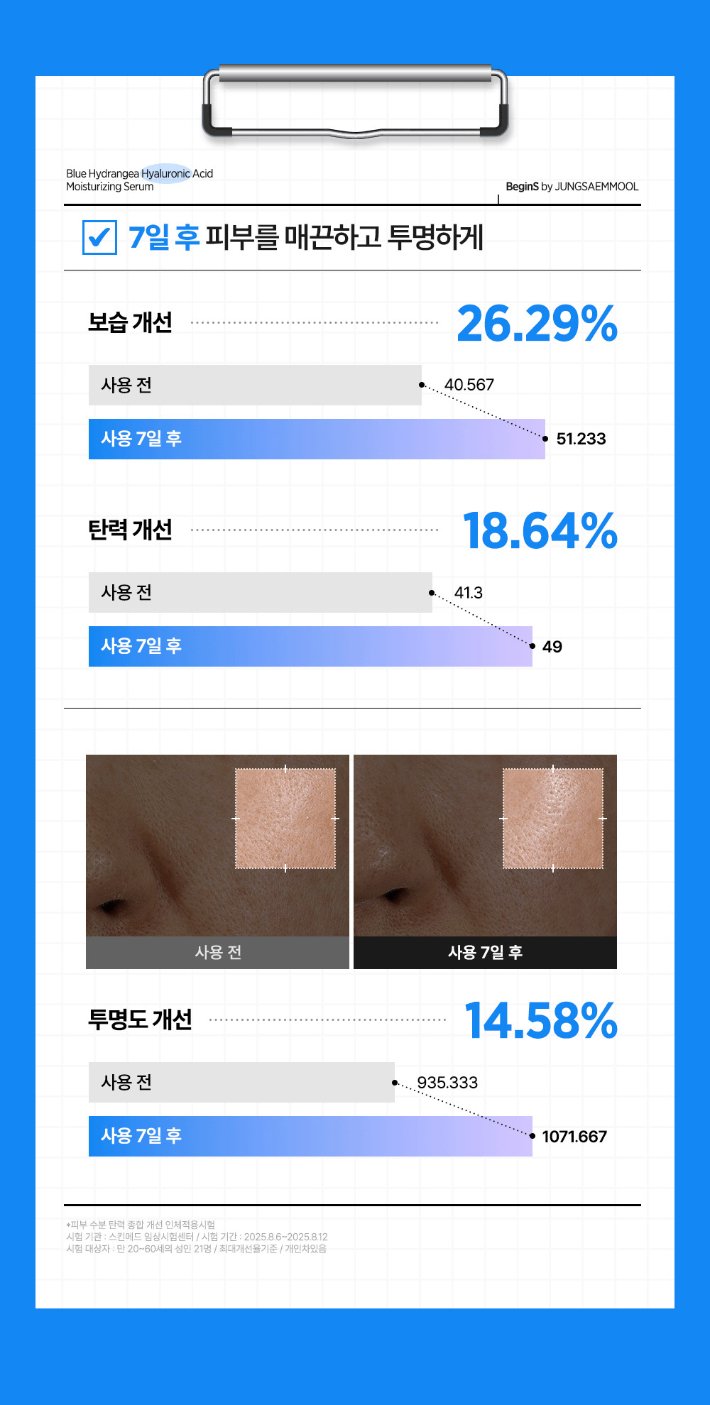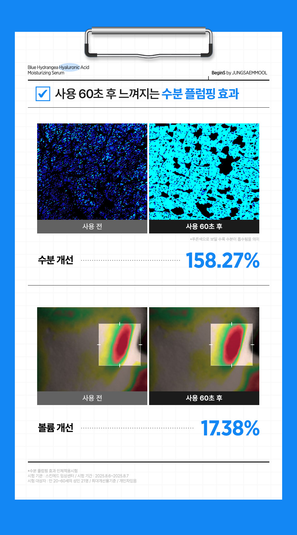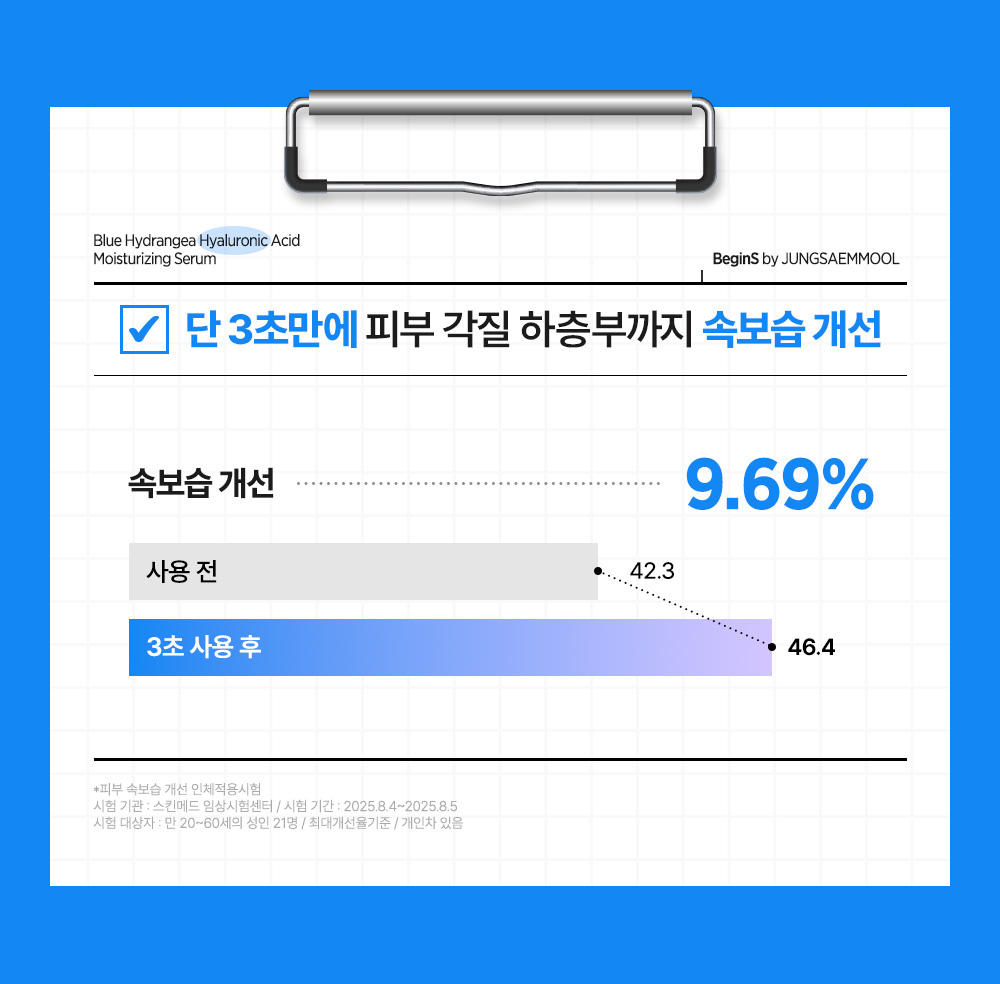 BeginS by JUNGSAEMMOOL Blue Hydrangea Hyaluronic Acid Moisturizing Serum10만개의 나노 히알 볼의 수분 레이어링으로 3초 만에 피부 속까지 촉촉하게 차오르는 수분 플럼핑 세럼 |