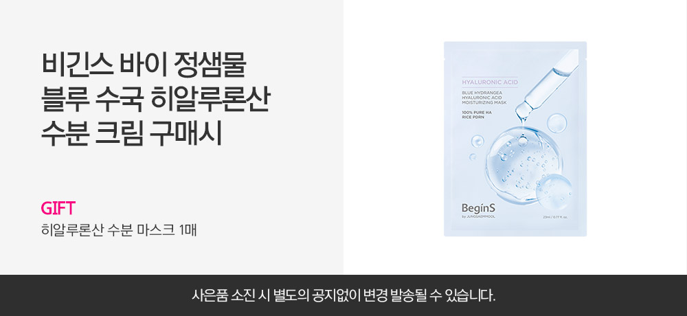 | 모든 원료성분 | 정제수, 부틸렌글라이콜, 글리세린, 카프릴릭/카프릭트라이글리세라이드, 하이드로제네이티드폴리데센, 하이드로제네이티드폴리아이소부텐, 세틸알코올, 세틸에틸헥사노에이트, 폴리글리세릴-3메틸글루코오스다이스테아레이트, 폴리글리세린-3, 비닐다이메티콘, 판테놀, 글리세릴스테아레이트, 코코넛야자씨버터, 1,2-헥산다이올, 글리세릴스테아레이트에스이, 피토스테롤, 베헤닐알코올, 하이드록시아세토페논, 알지닌, 아크릴레이트/C10-30알킬아크릴레이트크로스폴리머, 스테아릭애씨드, 마그네슘스테아레이트, 향료, 소듐스테아로일글루타메이트, 에틸헥실글리세린, 스테아릴알코올, 아라키딜알코올, 아데노신, 코코-글루코사이드, 수레국화꽃수, 하이드로제네이티드레시틴, 세라마이드엔피, 사이아노코발아민, 말토덱스트린, 하이드롤라이즈드치자추출물, 세테아릴알코올, 소듐하이알루로네이트(10.02ppm), 락토바실러스발효물, 토코페롤, 콜레스테롤, 소듐파이테이트, 포스파티딜콜린, 소듐다이라우미도글루타미드라이신, 수국잎추출물(0.05ppm), 소듐디엔에이, 하이드롤라이즈드소듐하이알루로네이트(0.025ppm), 다이메틸실란올하이알루로네이트(0.015ppm), 하이드롤라이즈드하이알루로닉애씨드(0.015ppm), 하이알루로닉애씨드(0.01ppm), 포타슘하이알루로네이트(0.01ppm), 소듐하이알루로네이트크로스폴리머(0.008ppm), 하이드록시프로필트라이모늄하이알루로네이트(0.008ppm), 소듐하이알루로네이트다이메틸실란올(0.005ppm), 소듐아세틸레이티드하이알루로네이트(0.004ppm), 글라이신, 글루타믹애씨드 |