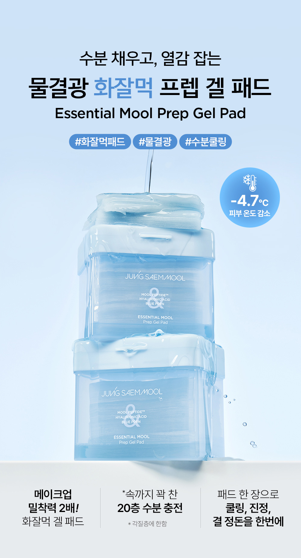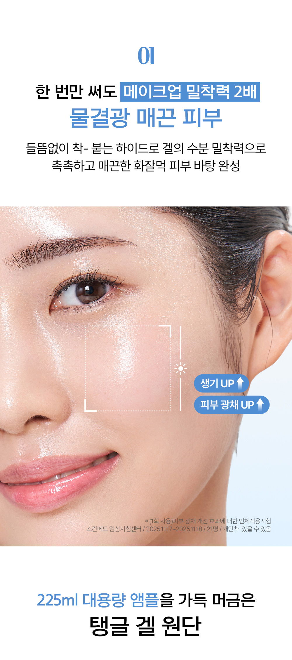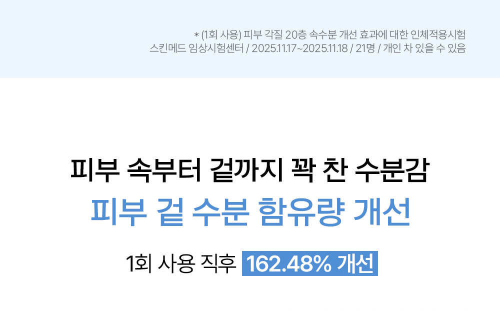 | 모든 원료성분 | 정제수, 글리세린, 다이프로필렌글라이콜, 메틸프로판다이올, 하이드록시에틸우레아, 프로판다이올, 하이드록시아세토페논, 폴리글리세린-3, 카프릴릴글라이콜, 글라이코리피드, 에틸헥실글리세린, 셀룰로오스검, 잔탄검, 카보머, 비스-에톡시다이글라이콜사이클로헥산1,4-다이카복실레이트, 덱스트린, 트로메타민, 베타인, 시트릭애씨드, 소듐시트레이트, 빙하수, 부틸렌글라이콜, 치자추출물, 1,2-헥산다이올, 오카무라큰실말추출물, 참갈파래추출물, 바다포도추출물, 다이포타슘글리시리제이트, 석시닉애씨드, 소듐구아이아줄렌설포네이트, 다이메틸실란올하이알루로네이트, 하이드롤라이즈드소듐하이알루로네이트, 하이드롤라이즈드하이알루로닉애씨드, 하이알루로닉애씨드, 소듐하이알루로네이트, 포타슘하이알루로네이트, 하이드록시프로필트라이모늄하이알루로네이트, 소듐하이알루로네이트크로스폴리머, 소듐디엔에이, 소듐하이알루로네이트다이메틸실란올, 소듐아세틸레이티드하이알루로네이트, 폴리글리세릴-10라우레이트, 트라이펩타이드-1, 아세틸헥사펩타이드-8, 카퍼트라이펩타이드-1, 아세틸테트라펩타이드-5, 팔미토일트라이펩타이드-1, 헥사펩타이드-9, 헥사펩타이드-11, 아세틸테트라펩타이드-2, 팔미토일펜타펩타이드-4, 팔미토일트라이펩타이드-5, 다이소듐이디티에이, 향료 |
