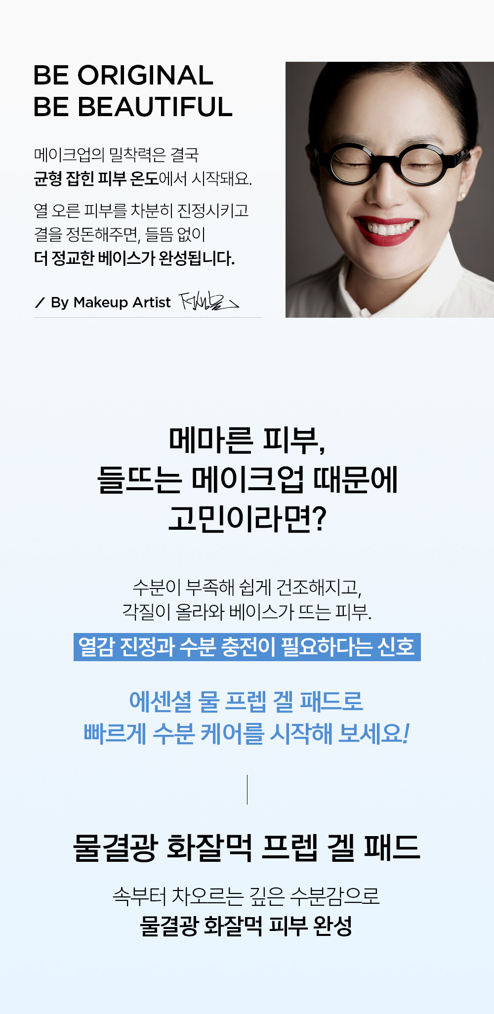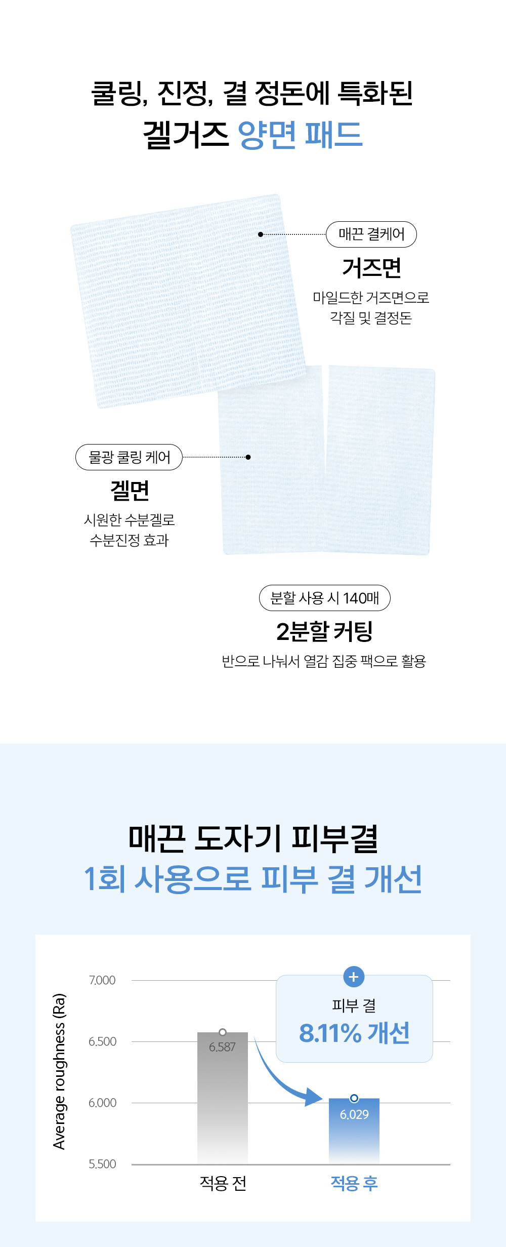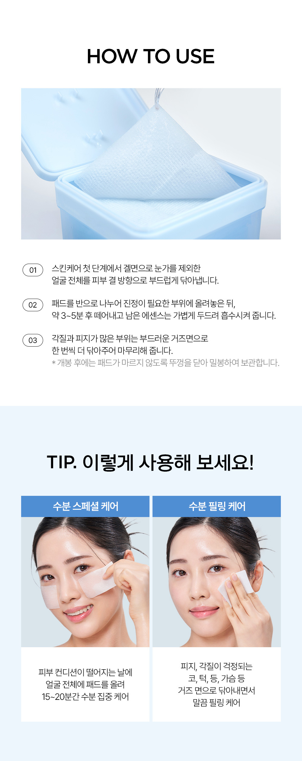 | 사용방법 | 1. 스킨케어 첫 단계에서 겔면으로 눈가를 제외한 얼굴 전체를 피부 결 방향으로 부드럽게 닦아냅니다. 2. 패드를 반으로 나누어 진정이 필요한 부위에 올려놓은 뒤, 약 3~5분 후 떼어내고 남은 에센스는 가볍게 두드려 흡수시켜 줍니다. 3. 각질과 피지가 많은 부위는 부드러운 거즈면으로 한 번씩 더 닦아주어 마무리해 줍니다. * 패드가 마르지 않도록 뚜껑을 닫아 밀봉하여 보관합니다. |