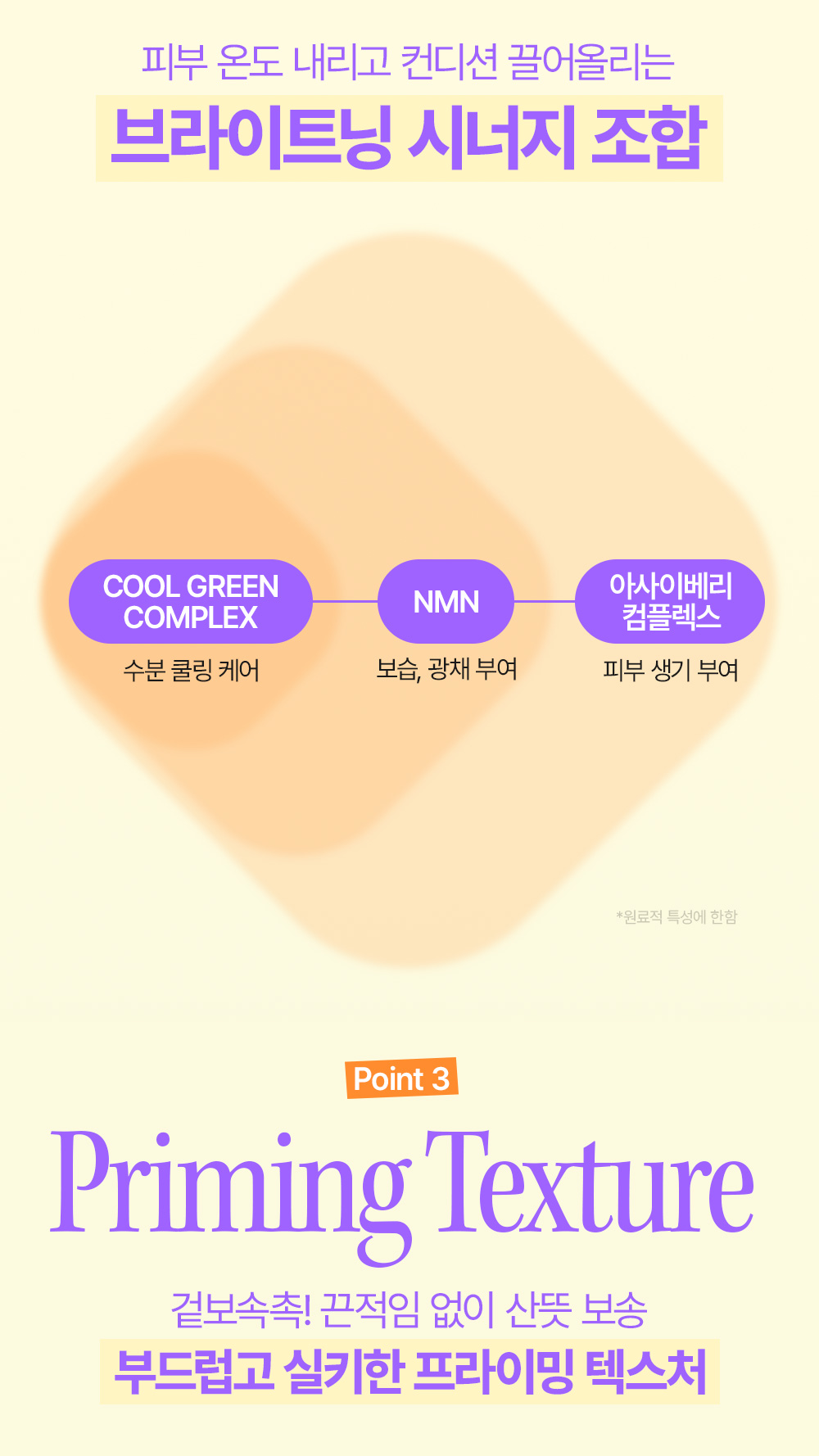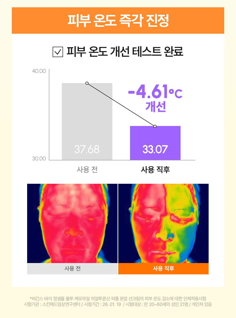 | 모든 원료성분 | 정제수, 다이부틸아디페이트, 프로판다이올, 에칠헥실트리아존, 드로메트리졸트리실록산, 나이아신아마이드, 티타늄디옥사이드 (CI 77891), 폴리글리세릴-3다이스테아레이트, 디에칠아미노하이드록시벤조일헥실벤조에이트, 테레프탈릴리덴디캠퍼설포닉애씨드, 트로메타민, 글리세린, 아이소노닐아이소노나노에이트, 코코-카프릴레이트/카프레이트, 다이메티콘, 세테아릴알코올, 1,2-헥산다이올, 울트라마린 (CI 77007), 포타슘세틸포스페이트, 글리세릴스테아레이트, 폴리메틸실세스퀴옥세인, 하이드록시아세토페논, 팔미틱애씨드, 카보머, 암모늄폴리아크릴로일다이메틸타우레이트, 스테아릭애씨드, 글리세릴스테아레이트시트레이트, 베헤닐알코올, 폴리하이드록시스테아릭애씨드, 폴리아크릴레이트크로스폴리머-6, 판테놀, 메틸프로판다이올, 알루미늄하이드록사이드, 폴리에터-1, 카올린, 잔탄검, 메틸다이아이소프로필프로피온아마이드, 에틸헥실글리세린, 트라이에톡시카프릴릴실레인, 아데노신, 다이소듐이디티에이, 부틸렌글라이콜, 소듐하이알루로네이트 (10ppm), 니코틴아마이드모노뉴클레오타이드, 마트리카리아꽃추출물 (10ppm), 폴리글리세릴-3메틸글루코오스다이스테아레이트, 하이드롤라이즈드소듐하이알루로네이트 (1ppm), 암모늄아크릴로일다이메틸타우레이트/브이피코폴리머, C14-22알코올, C12-20알킬글루코사이드, 카프릴릭/카프릭트라이글리세라이드, 월귤추출물, 빌베리열매추출물, 크랜베리추출물, 로우스위트블루베리추출물, 엘더열매추출물, 라즈베리추출물, 서양산딸기추출물, 포스파티딜콜린, 아사이팜열매추출물, 폴스애플민트잎추출물, 세라마이드엔피, 녹차추출물, 하이드록시신나믹애씨드, 타임잎추출물, 루틴, 글라이신, 세린, 글루타믹애씨드, 라이신, 알라닌, 트레오닌, 프롤린, 알지닌, 구아이아줄렌 |